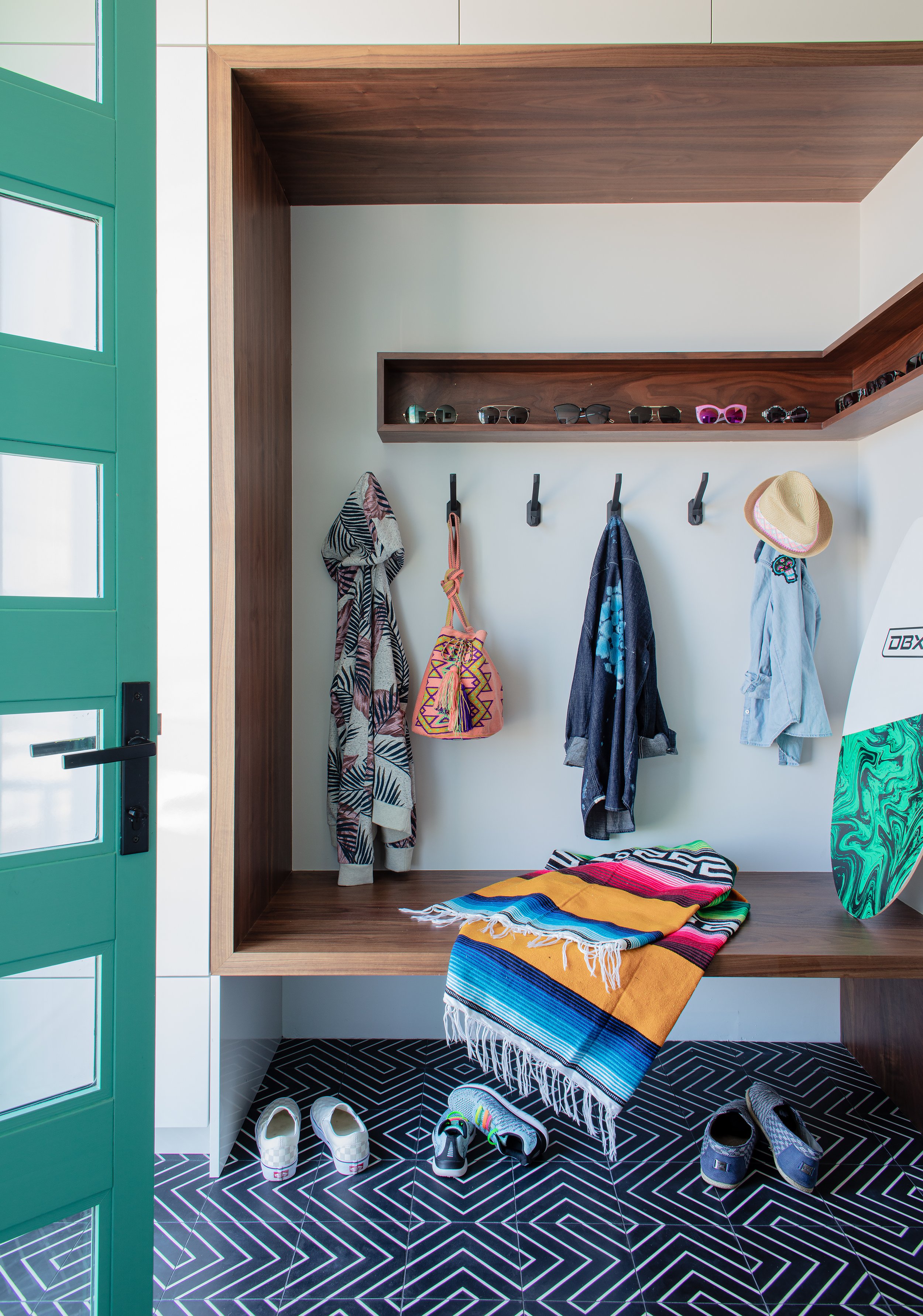 Formerly a kitchen, this space now serves as a family command center with custom locker-style storage, integrated charging stations, and a homework/craft table. Green accents, warm white oak, and a randomized black-and-white hex tile floor subtly reference the Boston Celtics color palettes and the energy of daily life.