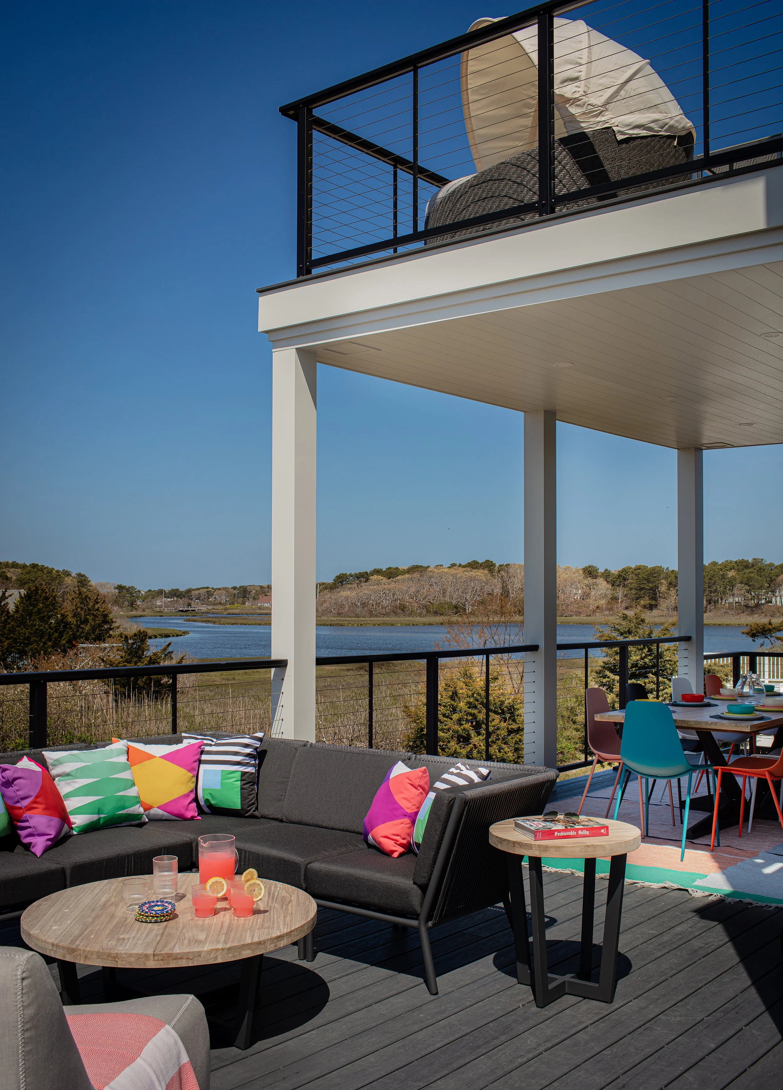 Designed from the architect’s floor plans and elevations, we led the project top-to-bottom—sourcing and specifying 100% of all building materials, custom cabinetry, furniture, lighting, and décor. The first floor open-concept layout seamlessly connects the kitchen, living room, and dining area, anchored by a one-of-a-kind custom kitchen that perfectly embodies the home’s modern coastal aesthetic.