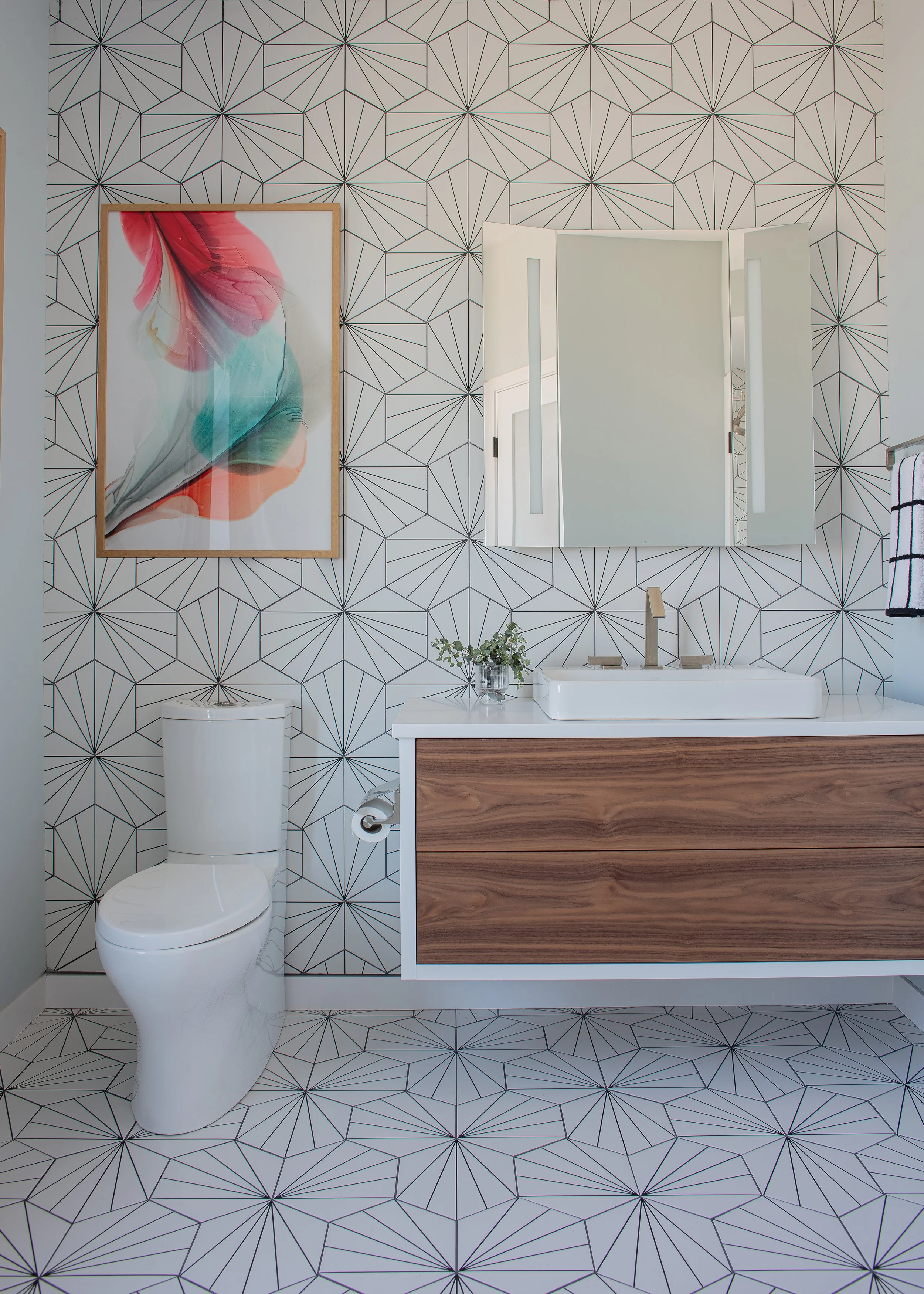 Underfoot, a three-color mosaic marble tile floor; pink, white, and black which adds visual rhythm, while radiant floor heating beneath ensures the space feels as good as it looks.