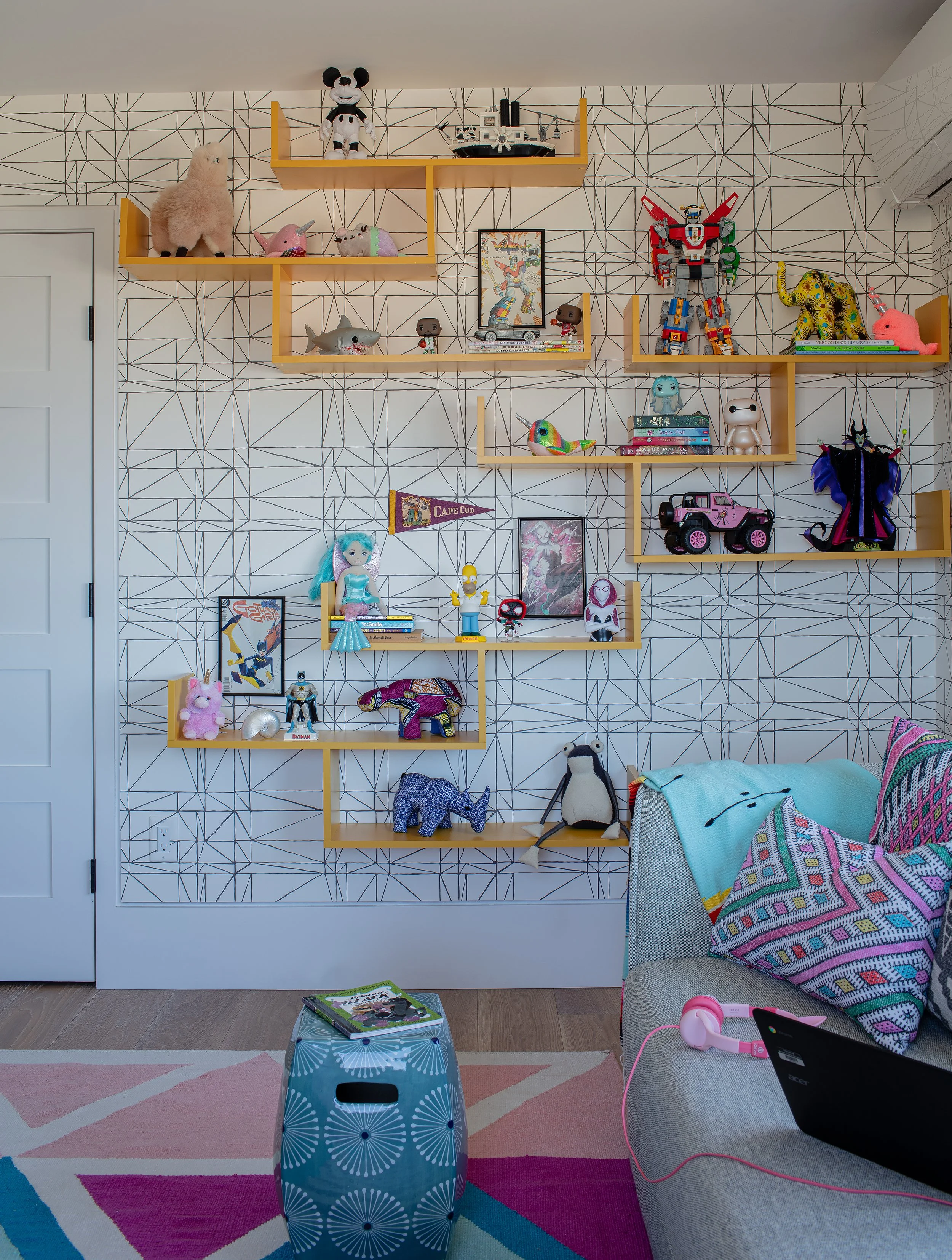 Designed with creativity and play in mind, the son’s bedroom features a hidden hangout space concealed behind a bookshelf door, along with cork tile walls designed for safely bouncing balls indoors. The lower-level man cave channels bold Art Deco energy, anchored by a fully restored 1930s pool table and a dramatic bar with geometric marble backsplash and deep teal cabinetry. A nearby mudroom with a sliding barn door discreetly conceals a game room and full bathroom.
