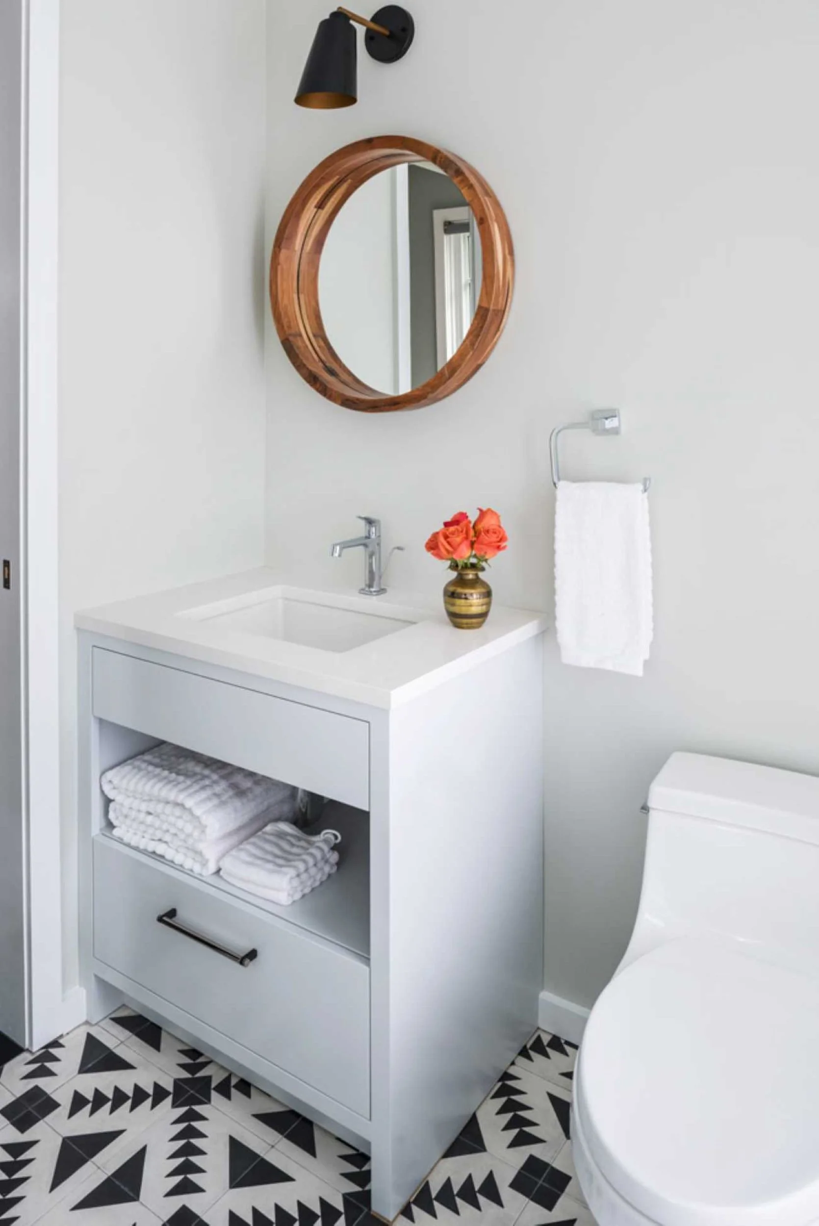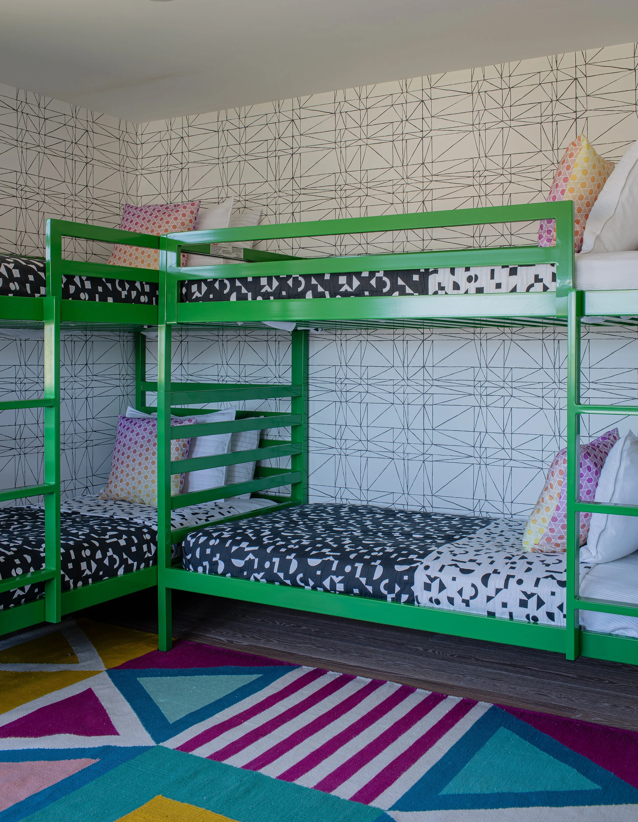 A combined laundry and kids’ bath maximizes efficiency with custom hardware-free cabinetry. Personalized drawer initials help streamline routines, while slip-resistant geometric tile ensures safety without sacrificing style.