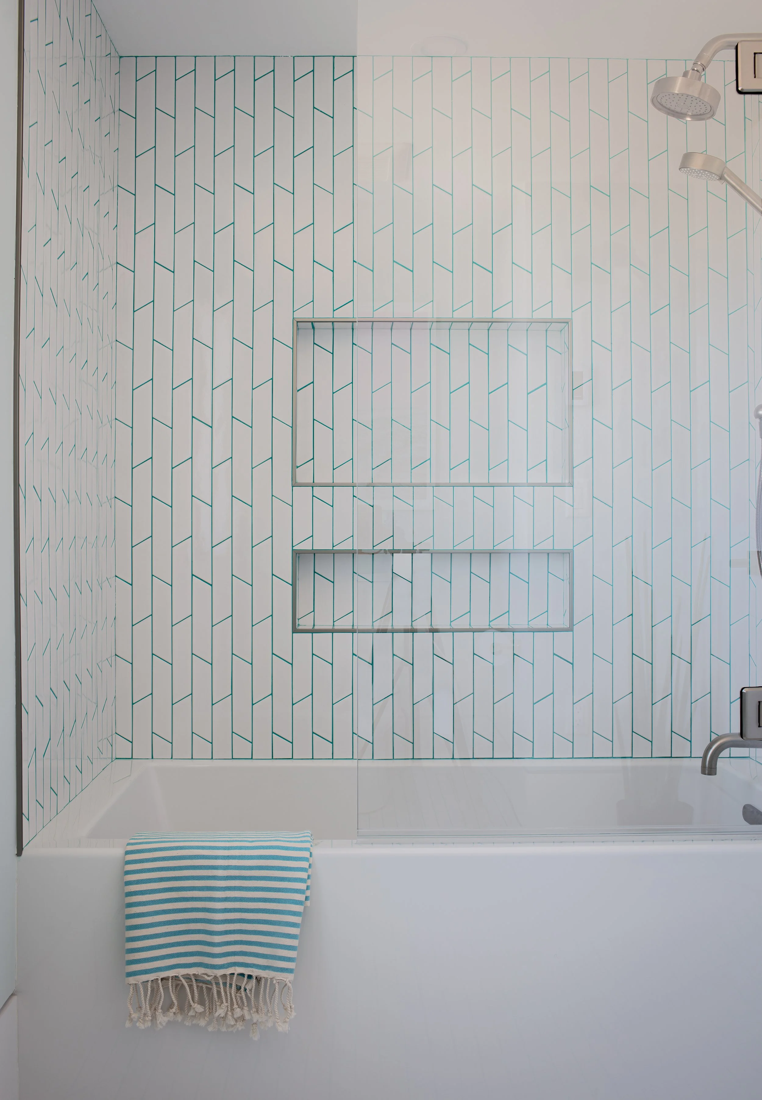 This full gut primary bathroom renovation features custom floating wood cabinetry, radiant heated herringbone tile floors, and a light-filled shower with a new window that highlights ethnic-pattern cement wall tile. Clean lines, natural materials, and modern craftsmanship create a refined, spa-like retreat.