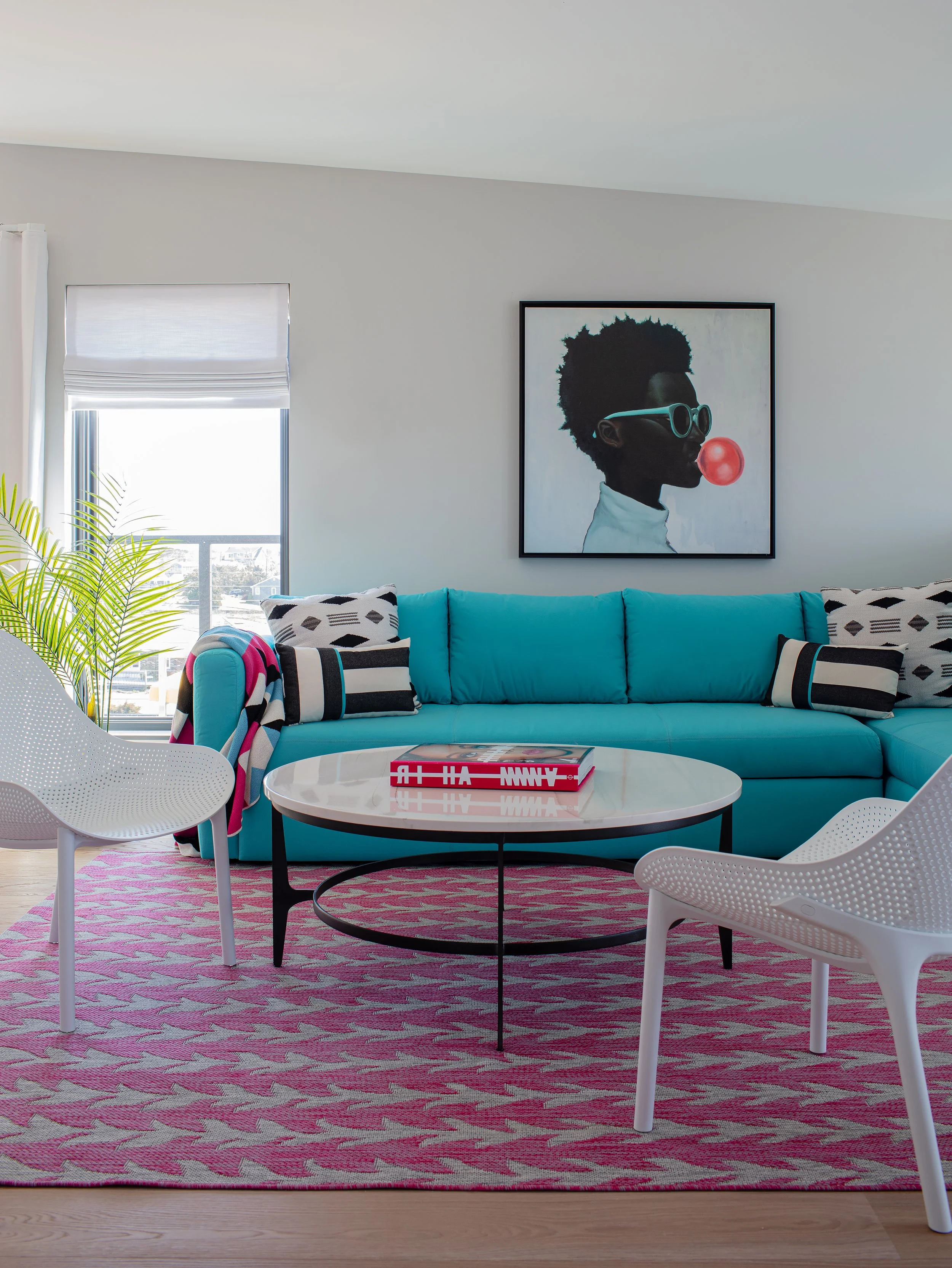 The home features 4 bedrooms, 4 full bathrooms, and a powder room, comfortably sleeping up to 12 guests. The third floor studio apartment functions as a private retreat, complete with a kitchenette, two balconies, and a teal sectional sofa with a hidden full-size bed. Throughout the home, wide-plank, solid white oak flooring by Carlisle provides warmth and continuity, while custom-designed cabinetry ensures every space is both functional and refined.