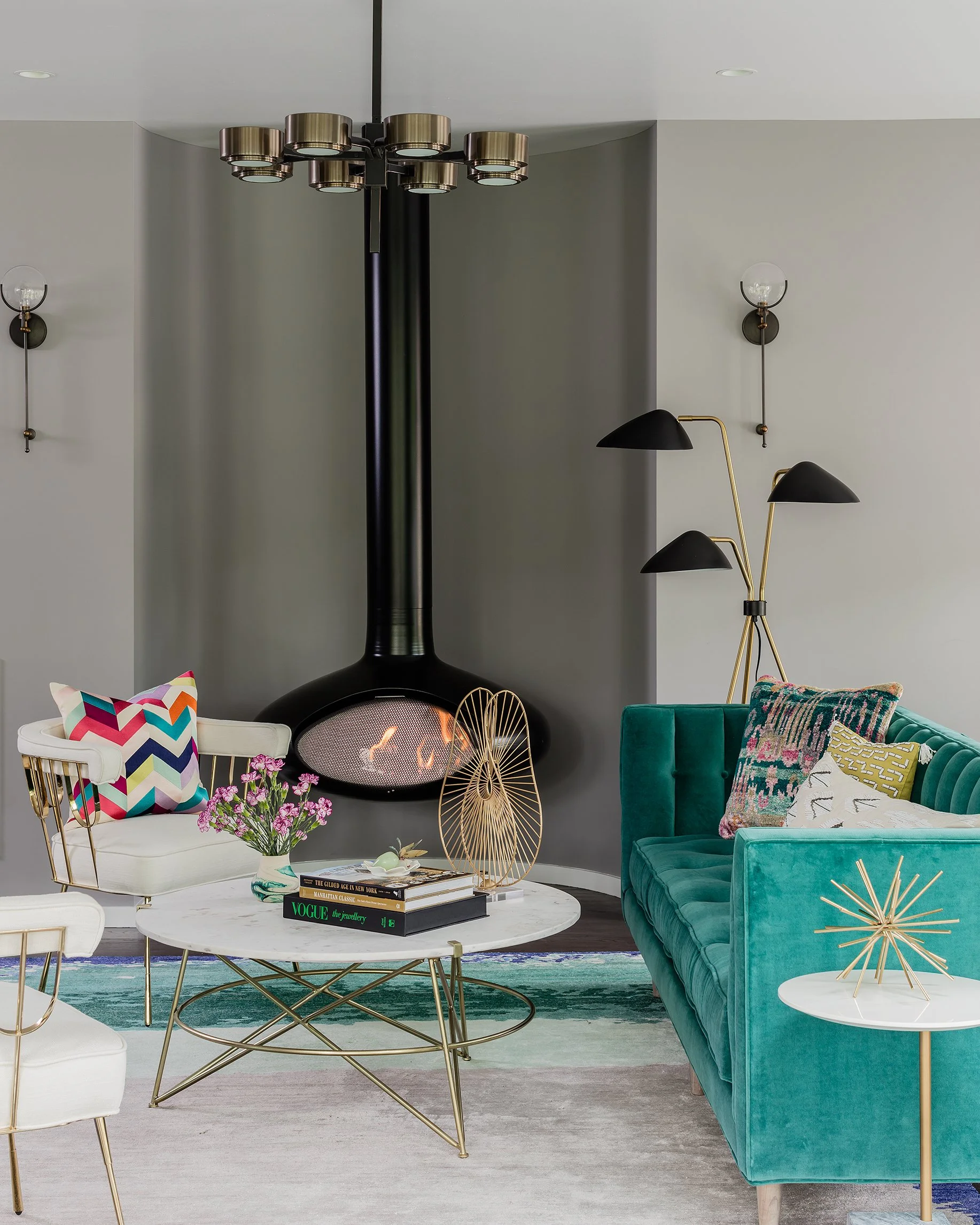 Working directly from the architect’s floor plans and elevations, we designed all custom cabinetry throughout the home and were responsible for sourcing 100% of the building materials, furniture, lighting, and décor. Standout features include two suspended fireplaces imported from Denmark—one in the kitchen and one in the formal living room—each with marble tile inlaid into the hardwood floors to form the hearths.