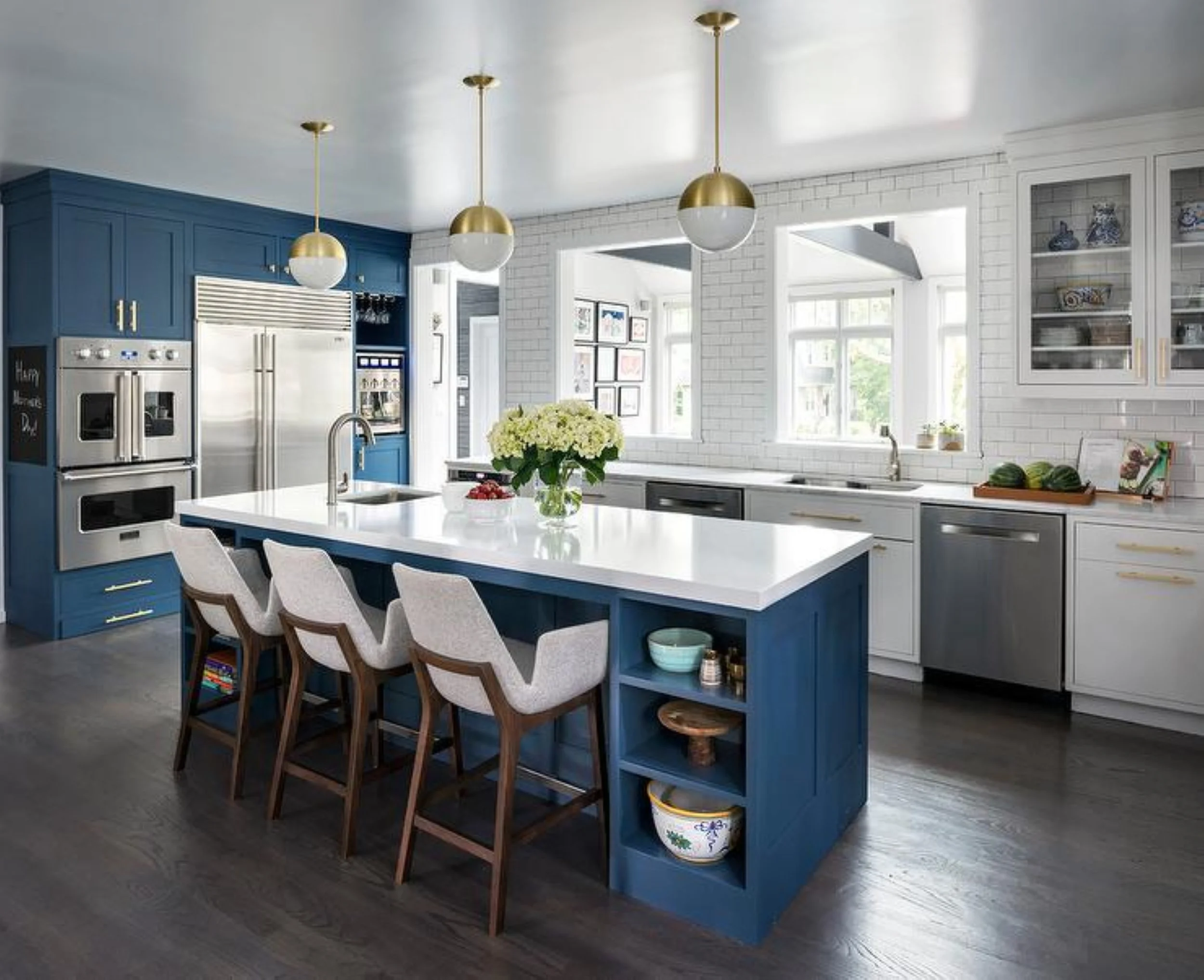 We replaced the dated layout with a custom cabinetry mix that brings both contrast and warmth—crisp white cabinet fronts framed in rich walnut, all grounded by a deep teal island that anchors the space and invites gathering. The result is a kitchen that works hard, looks effortless, and proves that a family kitchen can also be the coolest room in the house.