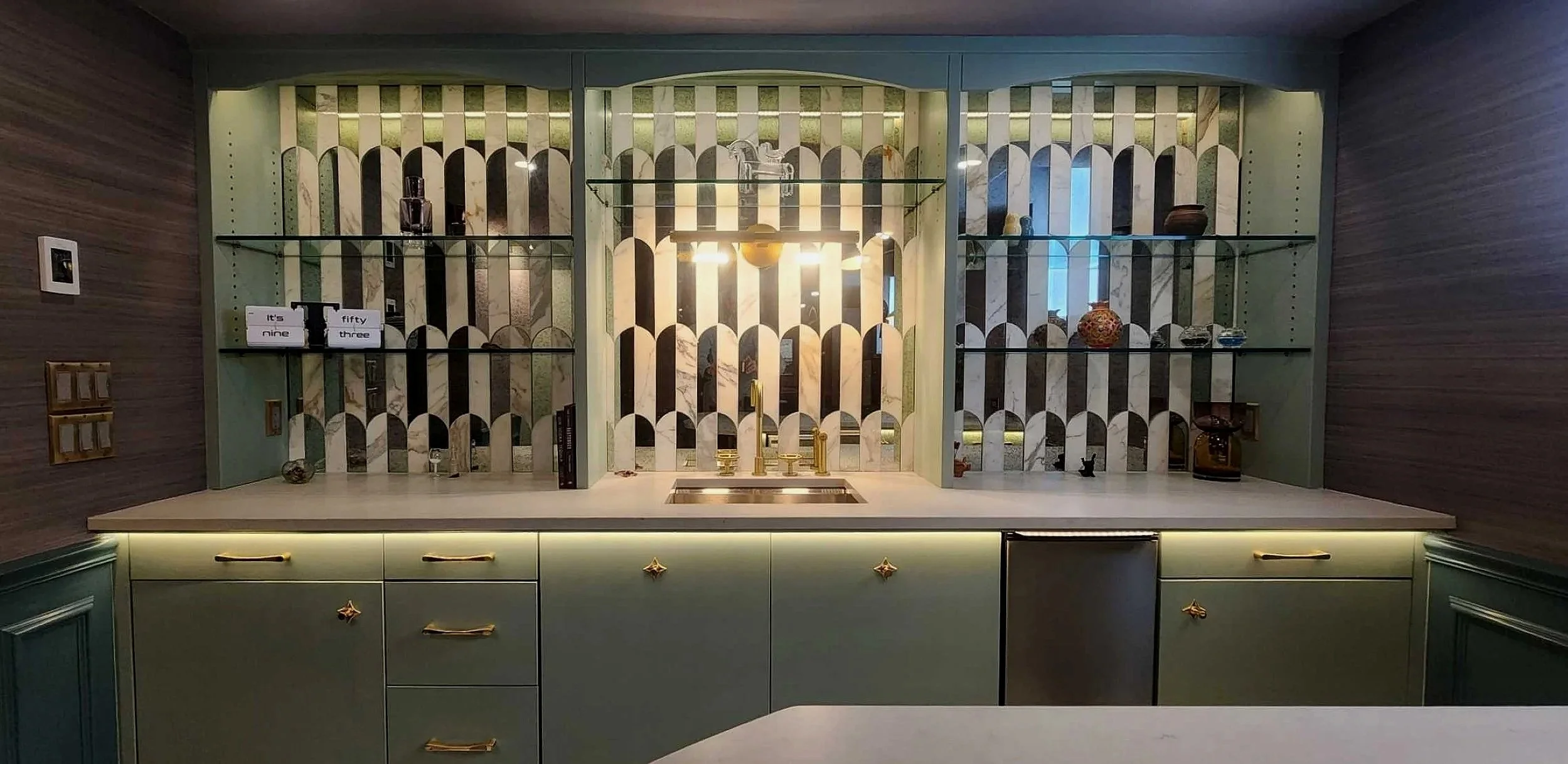 The final zone is a fully functional bar, designed for entertaining. A custom peninsula showcases an arched quartz countertop with integrated refrigerator drawers, while the wall-to-wall bar pairs quartz surfaces with a backsplash of antique mirror and Carrara marble. Polished gold plumbing fixtures and hardware serve as the jewelry, elevating every detail.
