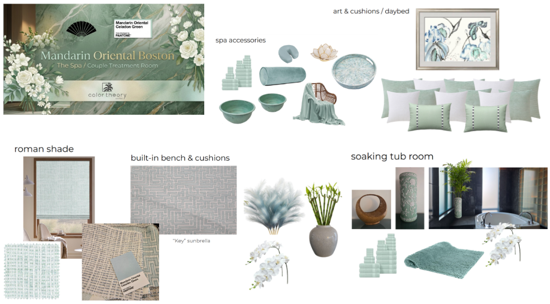 As if that alone wasn’t exciting enough, the Mandarin Oriental had just partnered with Pantone and officially licensed their color Celadon Green for a global marketing campaign. That color would become the foundation of the refresh. Flattered doesn’t even begin to cover it. We immediately rolled up our sleeves and dove headfirst into concept development—mood boards, inspiration imagery, and design storytelling all coming together at lightning speed. A few short days later, we received the news: we were selected as the design firm to breathe new life into their beloved spa room.